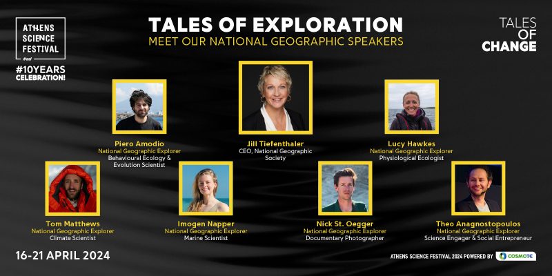 On Sunday, April 21, she will join a group of distinguished National Geographic Explorers in an unexpected panel that constitutes a real mission of the Organization on Greek soil. Lucy Hawkes – Physiological Ecologist, Nick St.Oegger – Documentary Photographer, Piero Amodio – Behavioral Ecologist and Evolution Scientist, Imogen Napper – Marine Scientist, Tom Matthews – Climate Scientist, and Theodoros Anagnostopoulos – Co-Founder of the Athens Science Festival and Science Engager, will take us from the depths of the oceans to the planet’s highest peaks, through their incredible experiences as National Geographic Explorers. Additionally, specially designed workshops will be offered to Athens Science Festival visitors who wish to connect with them and draw inspiration for protecting the natural environment.