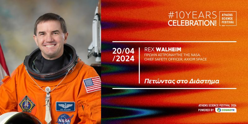Το Athens Science Festival σε συνεργασία με το Ελληνικό Κέντρο Διαστήματος ΕΛΚΕΔ και την Axiom Space φέρνει στην Αθήνα τον αστροναύτη Rex Walheim, και θα βρεθεί στη Τεχνόπολη Δήμου Αθηναίων για να μοιραστεί τη δική του “Ιστορία Αλλαγής” με τίτλο “Πετώντας στο Διάστημα”. Θα μιλήσει για την εξέλιξη των διαστημικών πτήσεων από το Πρόγραμμα του Διαστημικού Λεωφορείου (Space Shuttle Flight) έως τις εμπορικές διαστημικές πτήσεις και τον Διαστημικό Σταθμό Axiom. Θα μοιραστεί μαζί μας την εμπειρία του πετώντας στην τελευταία πτήση του διαστημικού λεωφορείου, ενώ θα μιλήσει και για την προετοιμασία πριν από την πτήση αλλά και πριν από τις διαστημικές βόλτες.