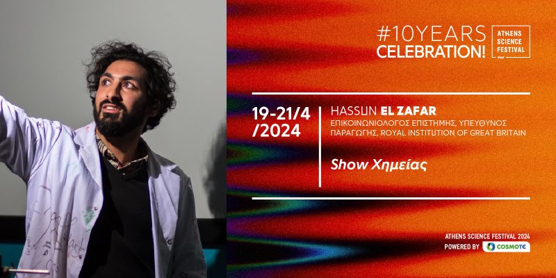 Μαγεία ή Χημεία; Ο εκπληκτικός κόσμος των αερίων συναντά τον «εκρηκτικό» Περιοδικό Πίνακα σε ένα chemistry show για τη μαγεία της Χημείας στο Athens Science Festival! Ελάτε να πειραματιστούμε και να διασκεδάσουμε παρέα με τον Hassun El-Zafar, με εκπληκτικά πειράματα και θεαματικά οπτικά εφέ, σε μία παράσταση σχεδιασμένη να εμπνεύσει μια βαθύτερη εκτίμηση για τις αόρατες δυνάμεις που διαμορφώνουν τον κόσμο μας.